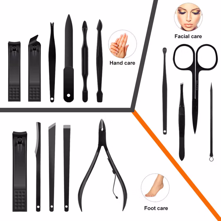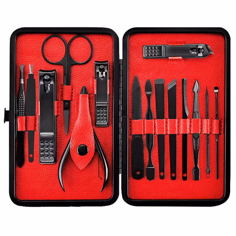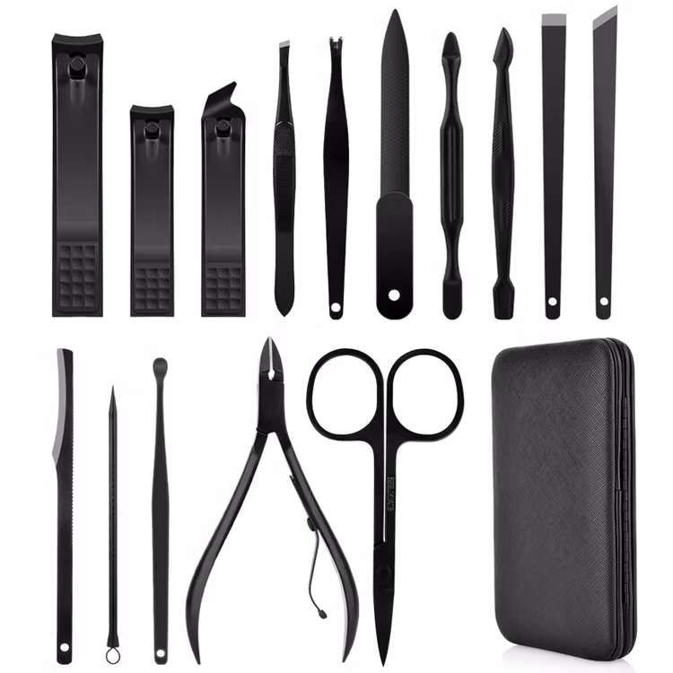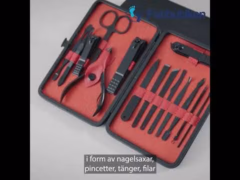 Nagelset för manikyr och pedikyr i toppkvalité med femton olika verktyg i form av nagelsaxar, pincetter, tänger, filar, nagelbandsverktyg och nagelklippare. Detta set innehåller allt du behöver för att vårda dina naglar på både fingrar och tår.