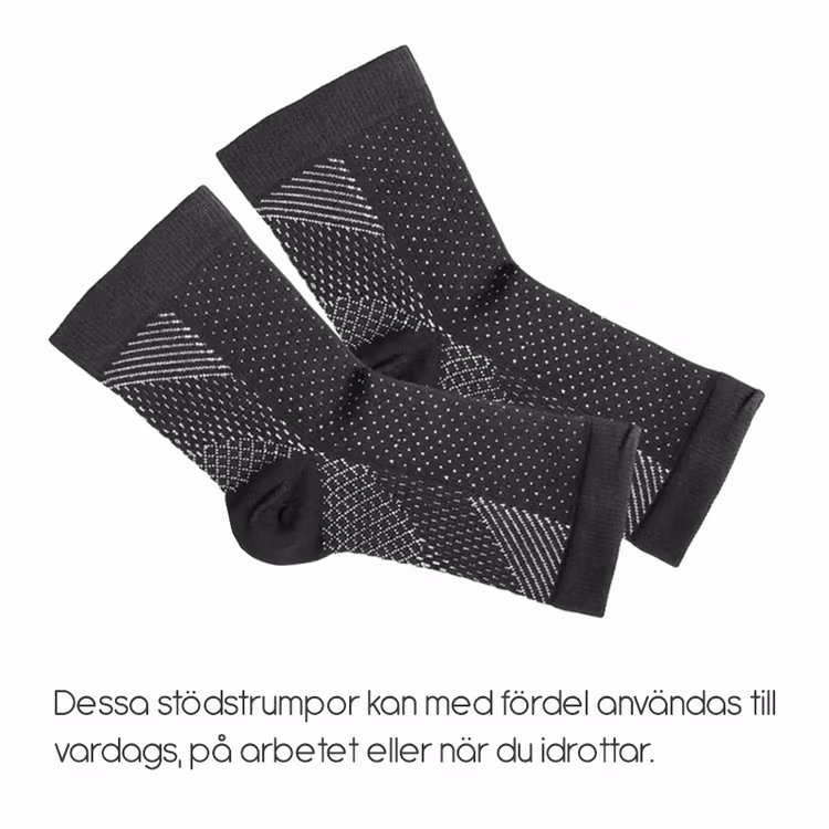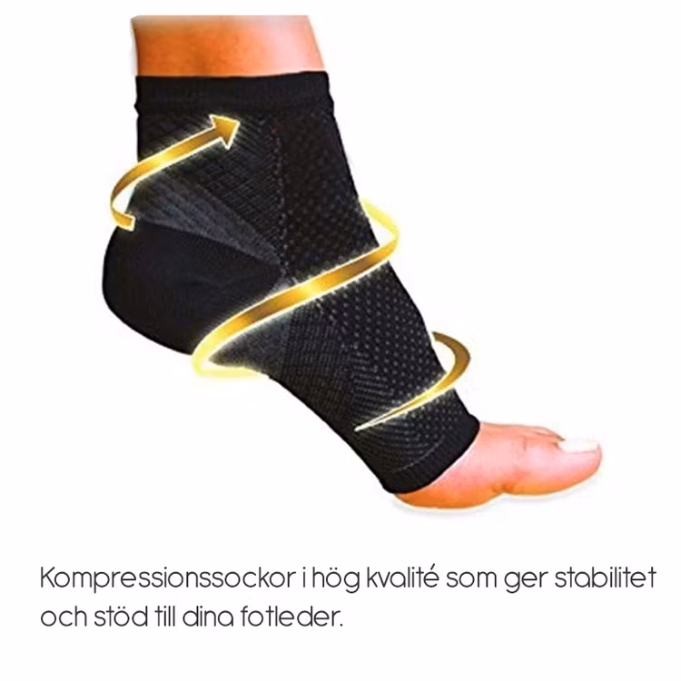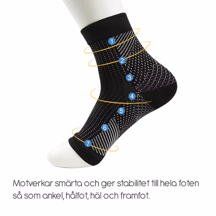 Strumpornas kompression minskar fotkramp Ankelstrumpor designade för att motverka fotkramp som vara ett effektivt hjälpmedel mot obehaglig kramp i fötterna. Dessa strumpor erbjuder kompression som främjar blodcirkulationen, minskar svullnad och stöder musklerna i fötterna. De är idealiska för dagligt bruk, särskilt för dem som står eller går mycket. Kompressionen kan hjälpa till att förebygga och lindra symptom på fotkramp.