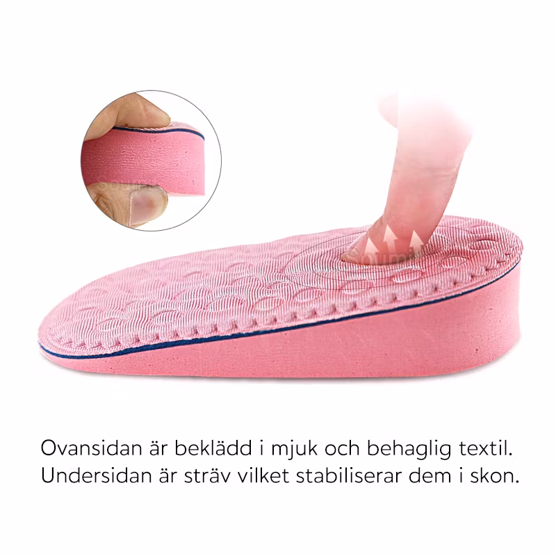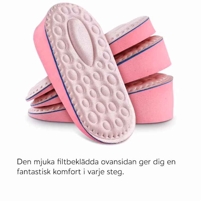 Inläggen är mjuka och lätta med en svettabsorberande funktion som gör de utmärkta att använda till vardags. Sulorna avlastar hälen och ger stötdämpning hela dagen. Passar utmärkt för den som vill bli längre, men helst inte tar på sig klackar. Insatserna passar de flesta typer av skor, såsom gympaskor, arbetsskor eller stövlar.