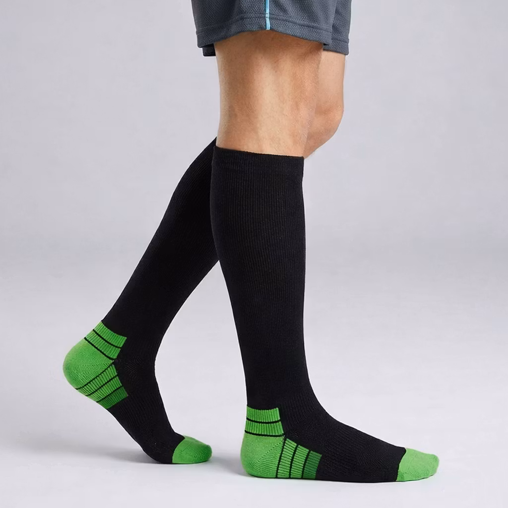Ett par stödstrumpor i grön som ökar blodcirkulationen i så väl dina fötter som i dina ben. Kompressionsstrumporna kan bland annat förebygga åderbråck, minska risken för skador när du tränar samt hjälpa till att hålla uppe cirkulationen i benen.